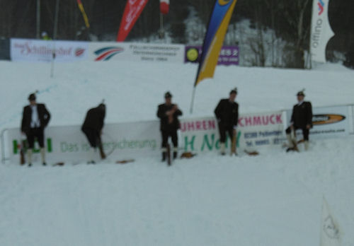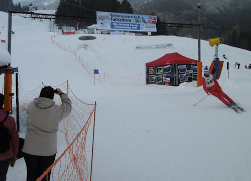 The Opening Ceremony was short and to the point with speeches from Dr. Rainer Hoenle, as President of the German Parachute Association,, followed by the Mayor of Unterammergau, and then Graeme Windsor as President of the International Parachuting Commission of the FAI. Graeme declared the 15th World Para Ski Championships open. I took a picture earlier of three of the Bavarian "muskateers" who opened the competition by life firing (no amunition!) some very ancient guns.
