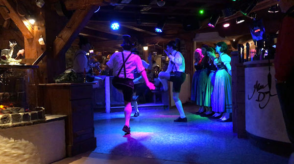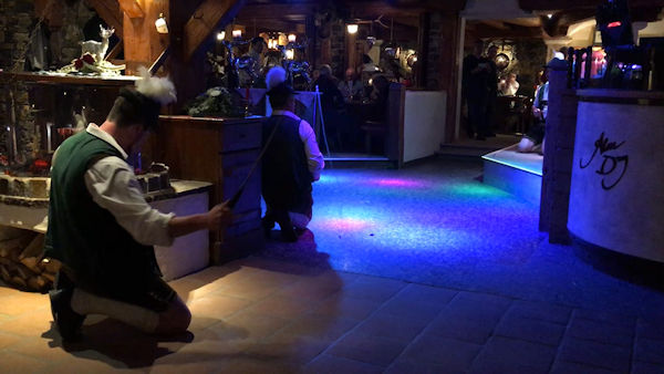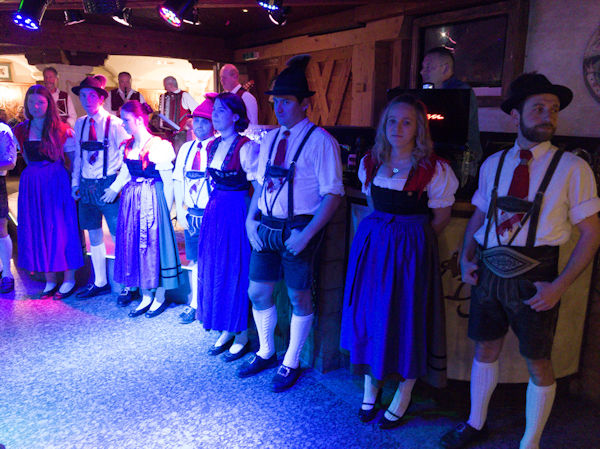 The buses took everyone up the mountain to a large hotel in Oberforsthofalm for the dinner and 'cultural' evening. A great authentic-feeling room, with areas, tables and bars exuding a fantastic atmosphere. The staff worked hard to serve us with a selection of 'tapas' or many different small dishes of food, some traditional to the area and some more global in taste - all in all different and very satisfying. Meanwhile we were treated to an orchestra/band playing traditional music along with a troupe of traditional Austrian dancers who entertained all evening with their unusual dances. The men dressed in traditional leidenhosen and the girls in their dirndl outfits. We had an exhibition of leg and thigh slaping from the men, whipcracking, chopping and sawing logs, and symbolic mining dance - all performed to music. At the end they included many from the competitors present in a traditional hand-clapping dance - great fun was had by all.