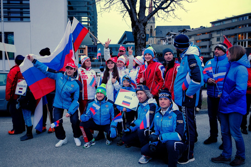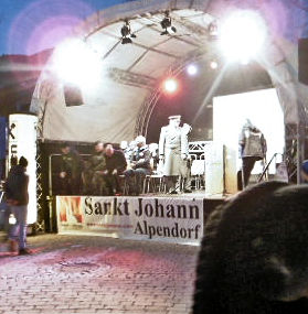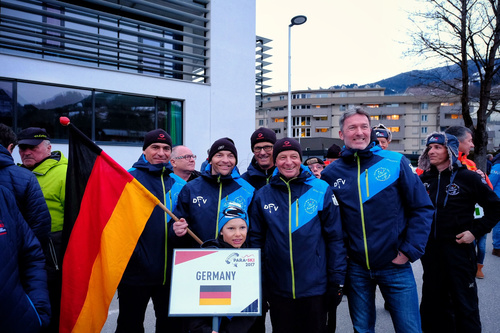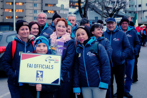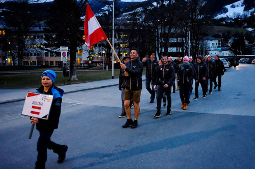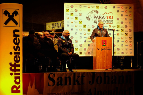 Yesterday evening the formal Opening Ceremony of the 16th World Para-Ski Championships took place in the Town Centre of St Johann and started with the arrival of the FAI Flag - flown very spectacularly into the arena by the HSV Red Bull Austria Demo team. For a moment it looked as if the flag was being burnt, but it was only the amazing sight of the parachutist flying with the both the flag and a firework. The other team members had red lights beneath them.