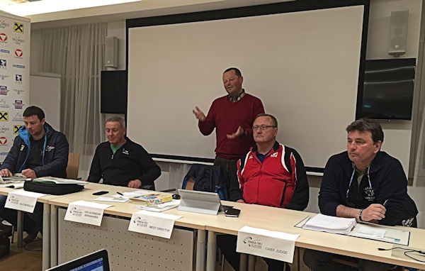 At the start of the Team Leaders' Meeting, which was extremely well organised and orchestrated by the Meet Director, Gernot Rittenschober, Wolfgant Hettegger welcomed everyone to Alpendorf, St. Johann, Austria and wished all a happy and successful competition. The FAI Controller, Gunter Berendt, then stated that the Jury had met with the Chief Judge and all was ready and fit to go. He also introduced his Jury (he now takes on the role of Jury President) as Mark Potapov (Russia) and Karl Keiser (Austria) and Blaz. Pavlin (Slovenia) Reserve.