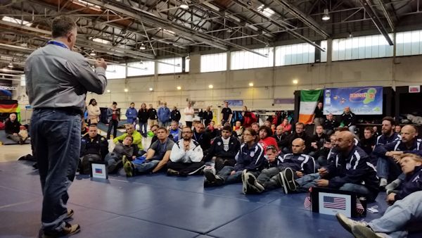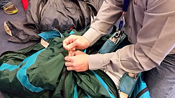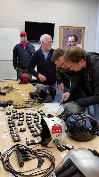The draw for the jumpers allocation of aircraft was undertaken at the end of the meeting, followed by the tagging of each jumper's wingsuit by Kate Charters and Randy Connell. This 'tagging' is to ensure that only that wingsuit is worn throughout the entire competition. Similarly the competitors brought their helmets to the Judges' room where the designated FlySight devices were affixed to each helmet by Klaus Rheinwald and his team and where they would remain on charge and under the supervision of the Judges until they were called to the flight line.
