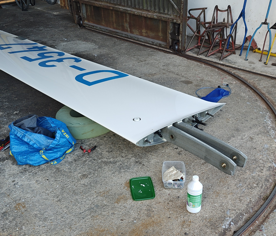 On the sixth contest day, I indeed had a problem with the LS8's water ballast system. Thanks to Wim Akkermans, who explained things over the phone from home, my loyal crew, and the extra help of Holger Back and Benno Beesten, we managed to fix it in time to fly with water. Luckily it was a day when the thermals developed late, so I ended up at the back of the grid anyway. After the first ten minutes the stress settled a bit. After the flight we disassembled and reassembled everything again to be sure it was perfectly sorted.