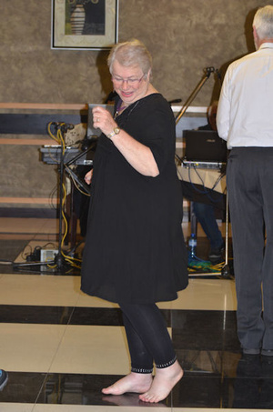 | Alternate Delegate for Germany, Gunter Berendt, with Lidia Anna Kosk from Poland. | Media Liaison Officer, Susan Dixon, discards her shoes and gets into serious dance mode | Alternate Delegate for Norway, Hans Christian Amlie, knows how to shake them hips! |