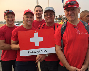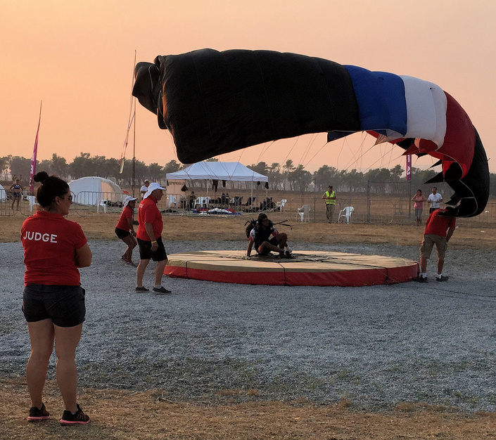 Congratulations to the Switzerland Team for a team score of 0.00 on their 8th round Jump. Is this a first for them? Just got news that the Czech Republic Team have also scored 5 0.00's on their Round 8 jump - Congratulations to them also. Also a small note of congratulations for one of our debutante male competitor's Isaac Brown (UK). Here at his first International Championships on a new accuracy canopy having only jumped fast canopies to date. He started the competition with 5, 0.16 scores, but listened to the advice he received from an international mix of help ; congratulations,on his 6th jump he scored 0.05, on his 7th 0.03 and 8th 0.11 - all on the pad.