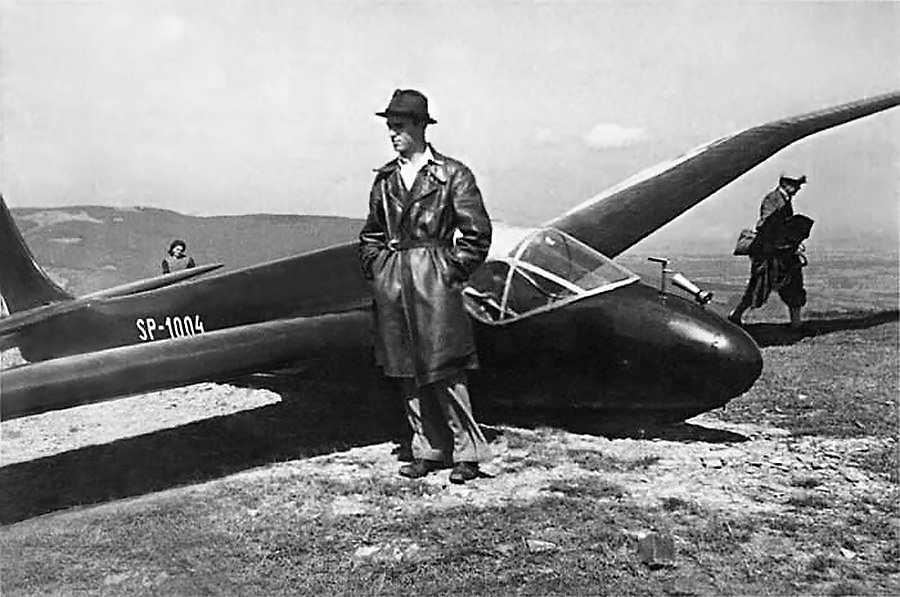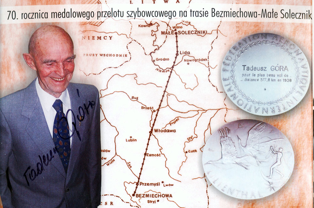 Born January 19, 1918 in Krakow Tadeusz Gora found to aviation in 1933 as member in the Vilnius Aeroclub. In 1936 he moved to the Gliding Academy in Bezmiechowa in the Carpathians, the Polish Wasserkuppe, soon showing his abilities by developing his gliding skills. One morning his instructor Adam Dziurzynski guessed good conditions and tasked Tadeusz for a cross country flight. Tomasz Kawa reports the personal statement of the late Tadeusz Gora at the question to which goal he would like to fly: "to Vilnius"! To his mom? After the common bungee cord start and 100 km in weak thermal and slope lift he reached decent currents: "on the right blue, on the left blue and I'm flying the magnificent PWS 101 under ever stronger trail of clouds in the climbs up to 5 m/sec." It was a convergence, rather unknown at that time. These good conditions ended before Lithuania, after a last cloud over Lida. Finally he landed in Solneczki near Vilnius gaining the Medal distance of 577,8 km.