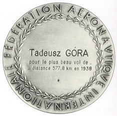 In 1938 the FAI decided to issue the Lilienthal Medal for Gliding, selected by the FAI Commission for Gliding, at this time named Commission Internationale de Vol Sans Moteur (CIVSM), meaning for flight without engine (in this era French was the international aviation language). The aim was to honour that soaring pilot with the most outstanding performance of the year, the longest flight in a straight distance. In 1938 it has been the Polish soaring pilot Tadeusz Gora for his cross-country soaring flight May 18, 1938 from Bezmiechowa to Soleczniki Male, both in Poland, 577,8 km.