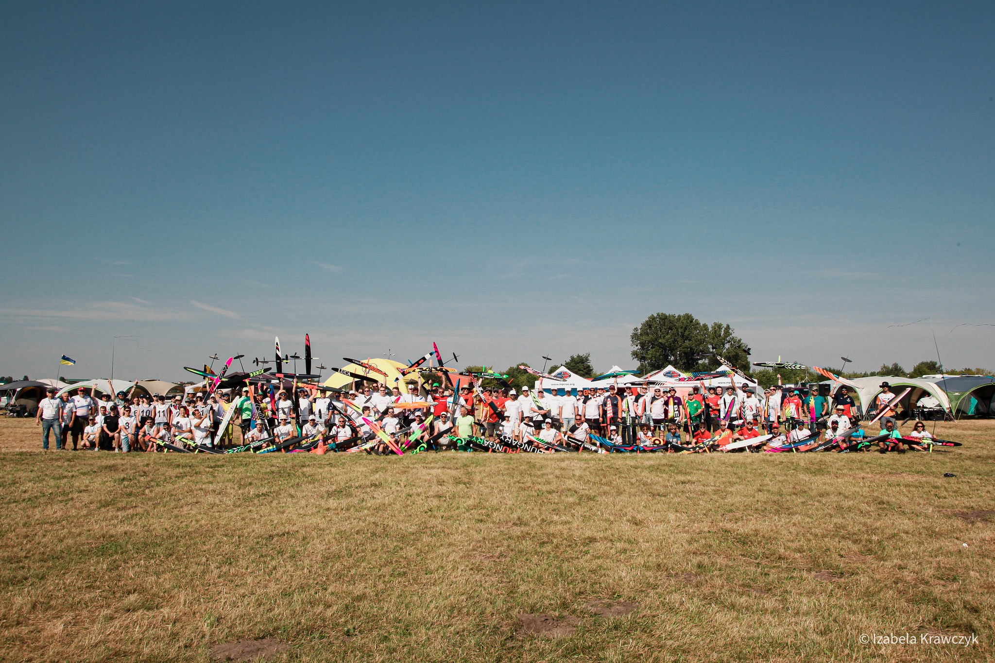 A clear and warm day to start Day 3 of the 2024 FAI F3K European Championships for Model Gliders in Włocławek, Poland, and it was a perfect opportunity to take a group photo with officials and competitors.