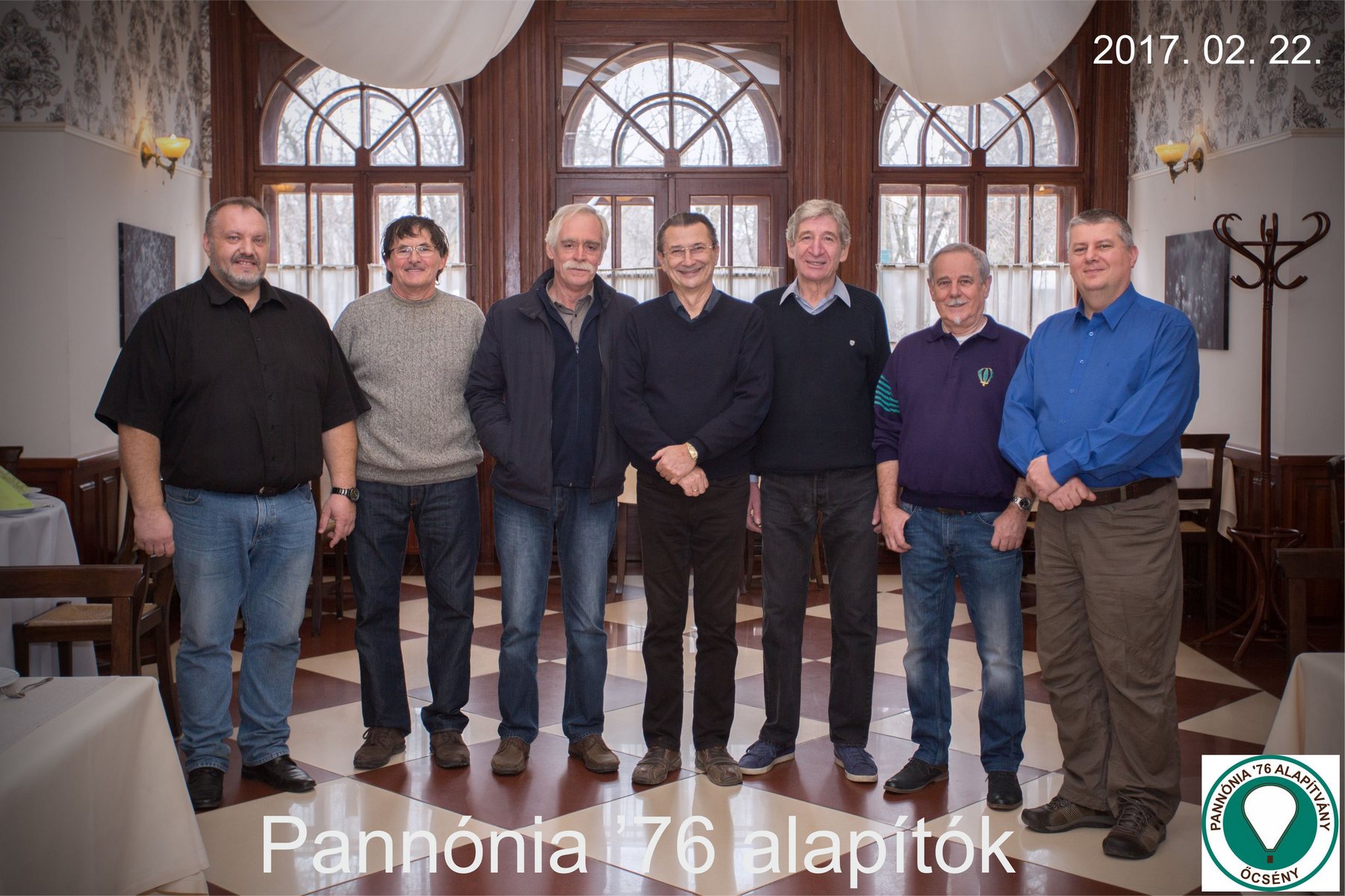 Founders (from left): pilot János Winkler; Tibor Németh, one of Pannonia's manufacturers and pilots; Sándor Szűcs, Hungarian champion and hot air balloon manufacturer; Mihály Sós hot air balloon and airship manufacturer; István Vona, one of Pannonia's designers; György Punka, test pilot of civil aviation authorities and aviation historian; Stieber József, president of the Pannónia '76 Foundation