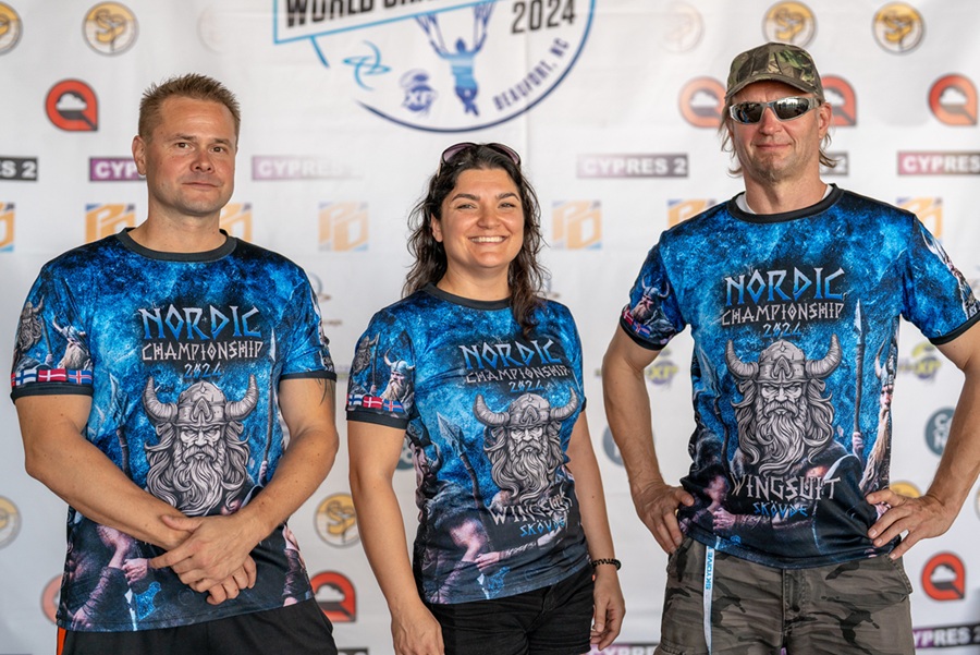 L-R Janne Saikko, Tatjana Maksudov and Marko Mäkelä at the 5th FAI Wingsuit Flying Championships in Beaufort, North Carolina, USA.