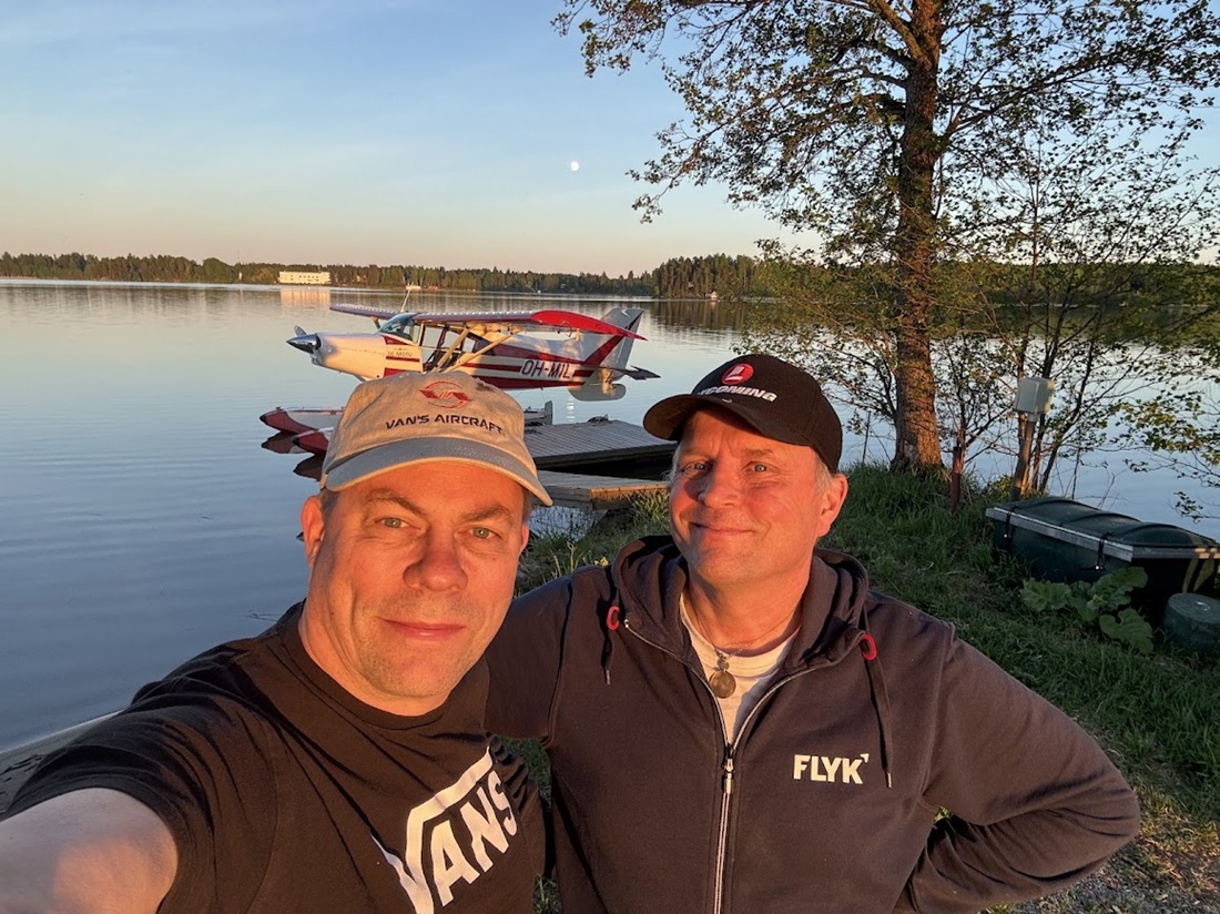 Timo Hyvönen on left with Mikko Sinervä, seaplane instructor from Aviaattori, by Tuusulanjärvi, Southern Finland after a training flight 21 May 2024 at 21.42 hrs