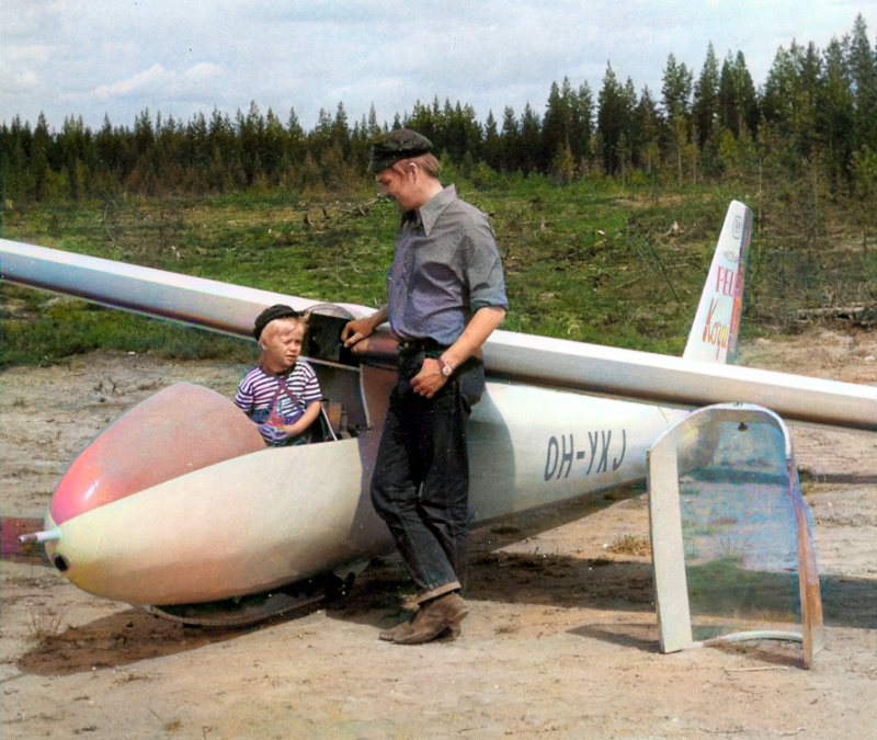 Timo in the cockpit of a PIK-3C Kajava with his father Heikki standing and holding the plane so that it will not fly away. Rautavaara 1968