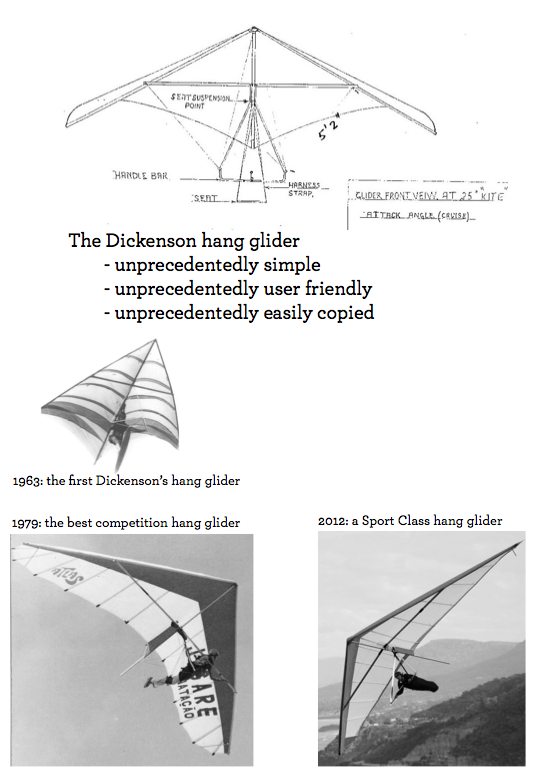 The magic of Dickenson’s device is the perfect coincidence of extreme simplicity, user friendliness and copy-ability. No other aircraft in history is as easy to build, fly and duplicate as the Dickenson wing. Almost 50 years after it was created, it is still the template for beginners’ hang gliders.