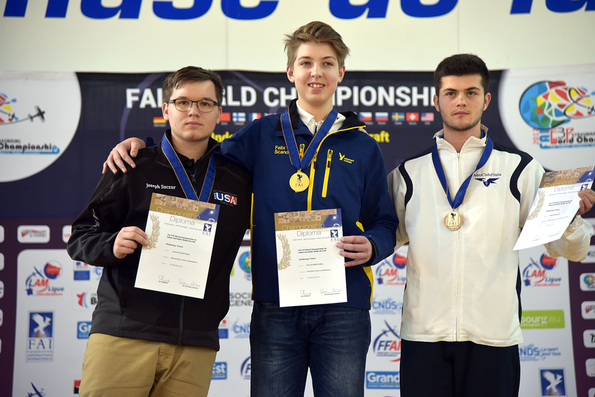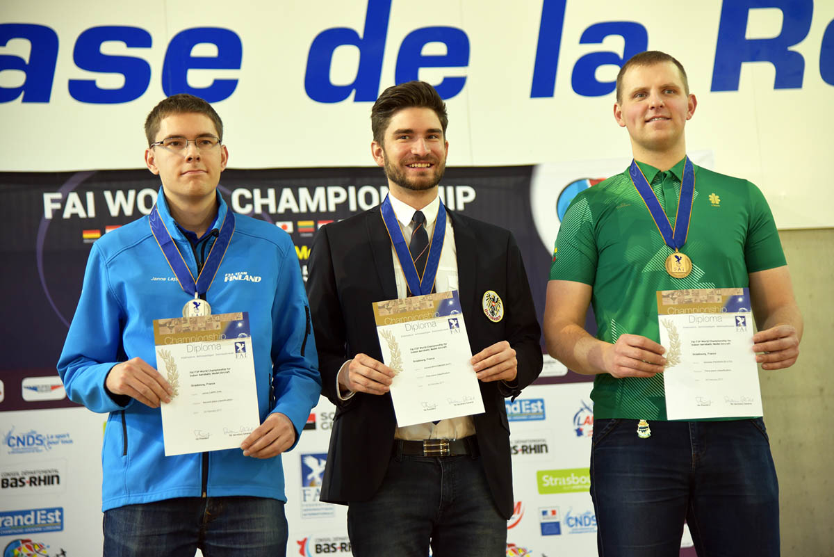 Gernot Bruckmann (left), a professional radio-controlled aeromodel pilot from Austria, won gold at the 2017 FAI F3P World Championship for Indoor Aerobatic Model Aircraft in France, when it finished at the weekend. The win came after a close-fought week-long competition that was held at the Rotonde Gymnasium in Strasbourg between 19-25 February 2017.