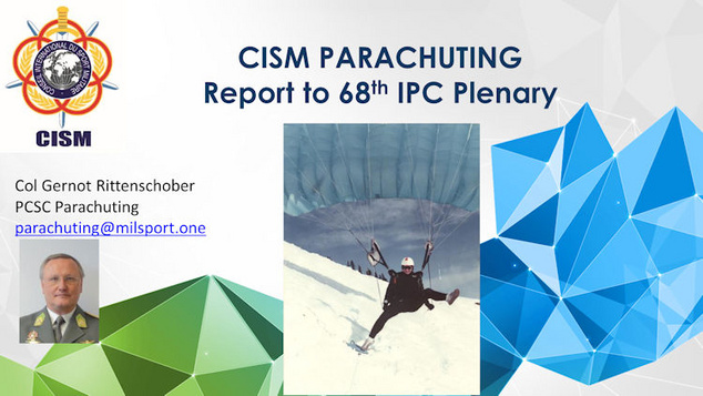 The 1st CISM Military Para-Ski World Championships 3rd-8th April in Hochfilzen/AUT and42nd WMPC which will take place in Szolnok/ HUN 10th -21st July 2018 were introduced, the invitation files are at http://www.milsport.one/sports/parachuting. Gernot also expressed his and CISM’s sincere thanks to Ani Stamenova and IPC bureau for changing the date of 35th FAI World Freefall Style and Accuracy Landing Championships in Erden, Montana by one week with the decision of IBD 3/17. Gernot invited nations with a military parachuting team to participate in 2018 WMPCs as observer or if they are one of the 136 CISM member nations as full participant with a team or individual competitors. For 2019 the 7th Military World Games in Wuhan/China were introduced, the present indoor bidders were made aware of the date 17-28 Oct which may have an impact on some FS 4way teams. His thanks was echoed by Istvan Sipos (HUN) and applause from the floor. He spoke of the continued programme within CISM of Judge Training, and also the decision to host a CISM Para-Skl competition.