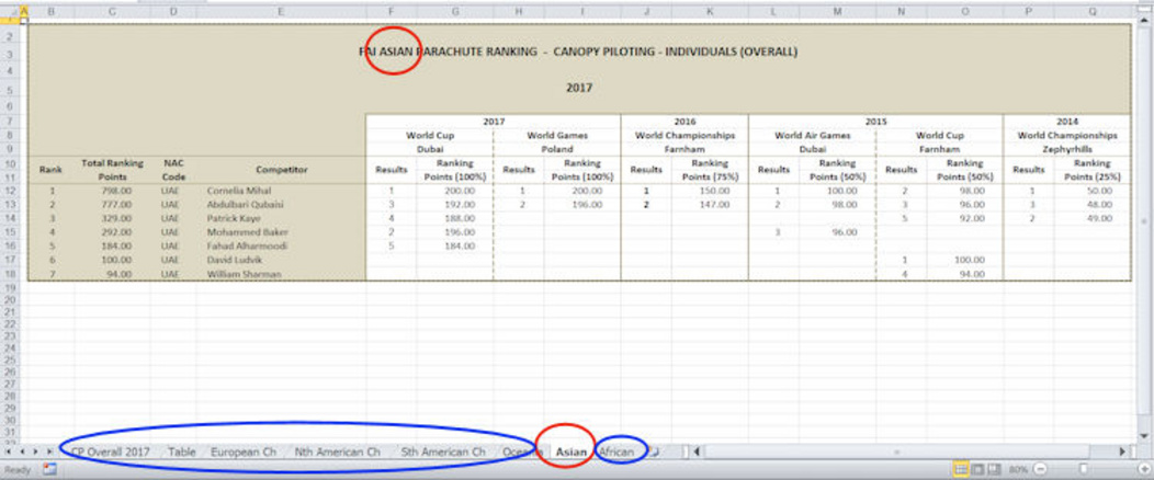 Continental Championships were drawn from both an actual event and derived from the World Events, then shown as separate lists. The image above depicts the CP ranking for the Asian continent - circled in red - but the World and other continental results would also be available - as shown in Blue. The rankings continue to be based over a 4-year period, with points awarded for the current year at 100%, dropping down 25% each year over the 4 year period. All World FCEs would count whether World Cups or World Championships. For individual disciplines Accuracy Landing (Male and Female), Freefall Style (Male and Female), Canopy Piloting, Solo Freestyle, Para-Ski Individual Overall (Male and Female) the new tables would be established. With the new system of calculation we would retain the Team events as a NAC listing - and in the case of a World Cup where more than one team could enter, only the best team of the two would count.