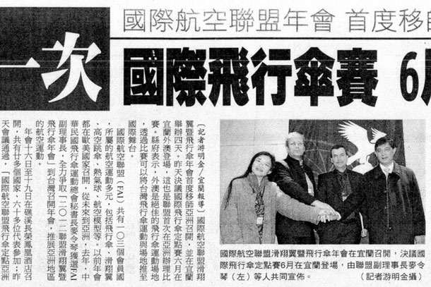 Elsa Mai (Chinese Taipei Delegate), Agust Gudmundsson (CIVL President), Jean-Marc Badan (FAI Secretary General) and a Jiao-Xi Representant on the Front page of the local press.