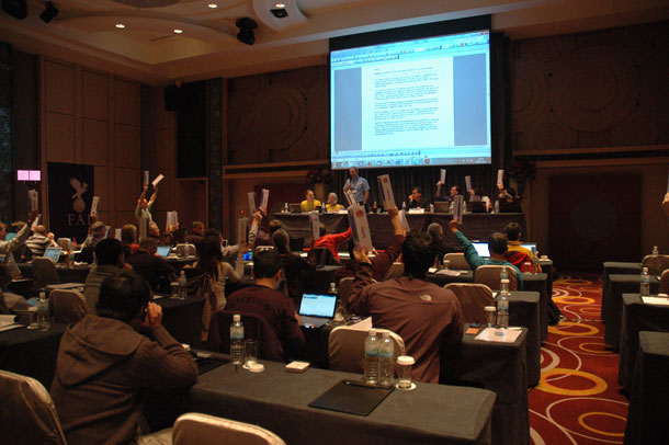 The newly elected Bureau: Igor Erzen, Calvo Burns, Agust Gudmundsson, Jamie Shelden, Stéphane Malbos, Goran Dimiskovski and Hamish Barker.