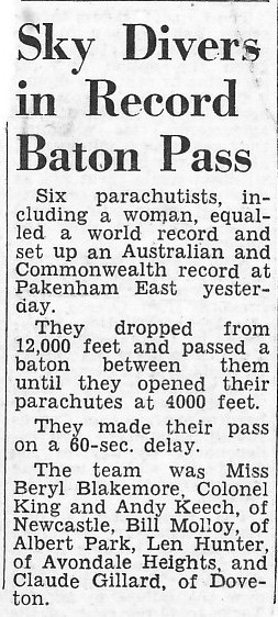 He was on a high altitude record jump from 23600 ft in 1961, was part of the first baton pass in Australia in 1962 and achieved a 6-man baton pass record in 1964. He was a successful Style and Accuracy competitor. He wrote the first Australian Parachute Instructor Manual, developed instructor courses and more.