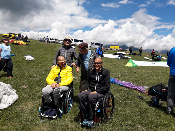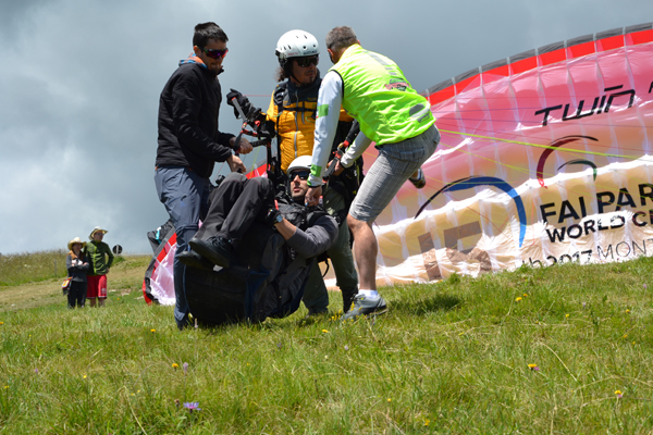 Today we have very special guests! The organization committee also have partner relations with Viaggio Italia - an activity group for people with disability. So for the occasion of the opening of the Worlds championship sevral guys were taken in tandem flights. Even if you cannot walk you can fly. Thus they demonstrated that paragliding gives freedom to everyone!