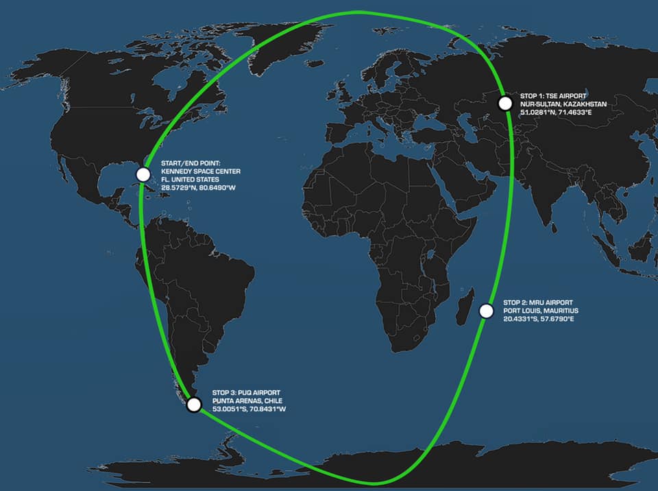 The team’s Qatar Executive Gulfstream G650ER aircraft landed at the NASA Kennedy Space Center in Florida at 8.12am on 11 July, after a round trip that took in both the North and South Poles and took 46 hours, 39 minutes and 38 seconds.