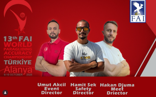 13th FAI World Paragliding Accuracy Championships have launched in Alanya-Antalya, Turkey. The event will be held from  Oct 9 to Oct 19, 2025. It is organized by Alanya Air Sports Club & Ulu Sky Paragliding on behalf of the Turkish Aeronautical Association (the NAC) and Türkiye Air Sports Federation (the holder of Sporting Powers).