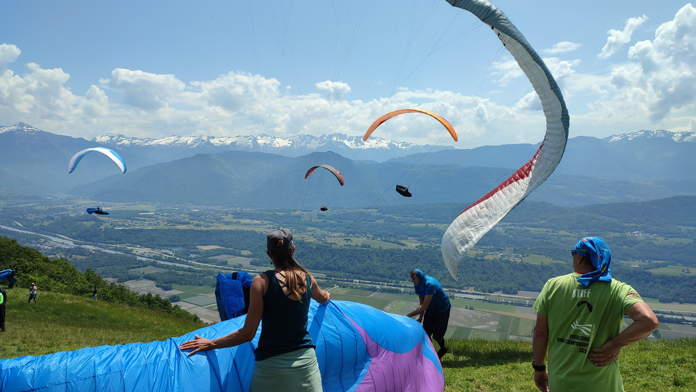 After 1,5h of flying the leading gaggle made all mountainside turn points and was approaching Cruet getting ready to cross the river valley. About 25 pilots landed, unable to proceed among them was William Pardis - the winner of the previous day. At that moment the leaders were: Luc Armant, Tim Bollinger, Maxime Pinot, Soheil Barikani, Yassen Savov, Juan-Sebastian Ospina-Restrepo, Russell Ogden, Meryl Delferriere, Luis Martinez-Iturbe, Darko Stankovski. The leading gaggle flew at a speed of 50 km. But Max Pinot, and Luc Armant pushed the speed bar up to 70 km/h to take the Cruet TP faster.