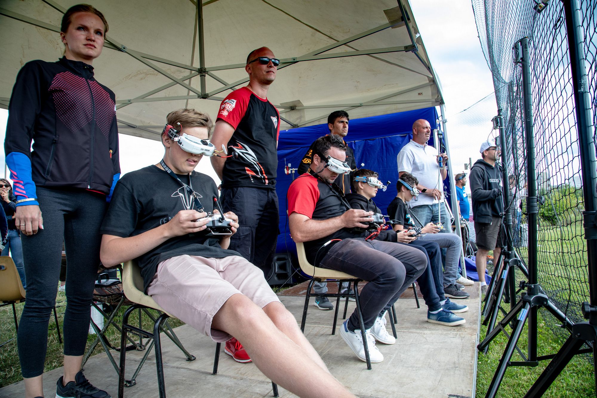 The pilot area, where pilots prepare their drones for racing, will also typically be enclosed by netting. It is here that pilots must observe the protocol to remove the propellers from their drones while they work on them.