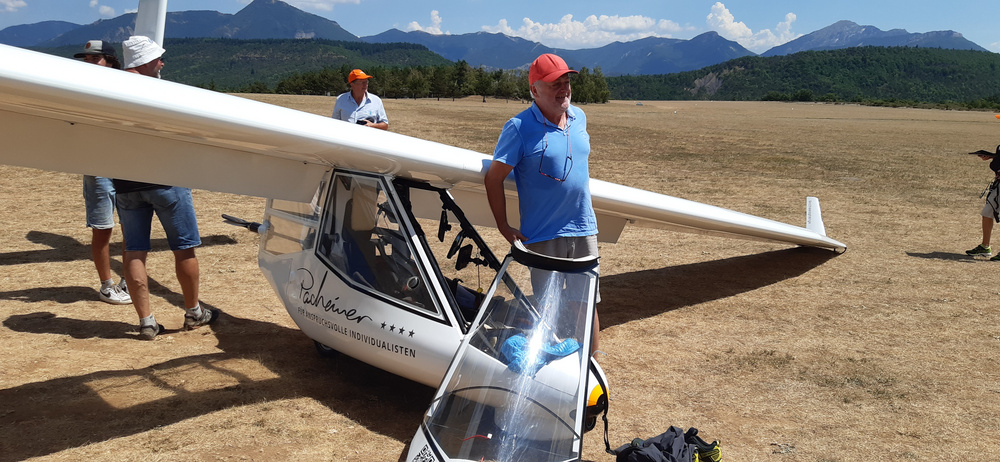 Louise Joselyn reports: On July 27 the first task was set -  136.2 km. Start opened at 12:30. Well, that was fast!  The organisers estimated maybe 3 hours for the task, but the first pilot, Manfred Ruhmer (AUT), landed back in goal on his Swift-Light in less than 2 hours.  He was swiftly followed by countryman Franz Pacheiner in the Archaeopteryx, with Jacques Bott (FRA) landing third.  Within 10 minutes most of the rest of the field had also landed at goal.