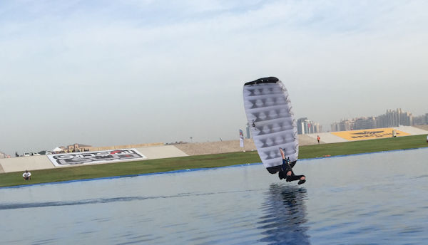 The Judges on their way to the Pond for the last time at this competition - 7.30 lift off for the third round of Canopy Piloting Freestyle, in the background the iconic skyline of Dubai and myriad balloons which had an even earlier start this morning.
