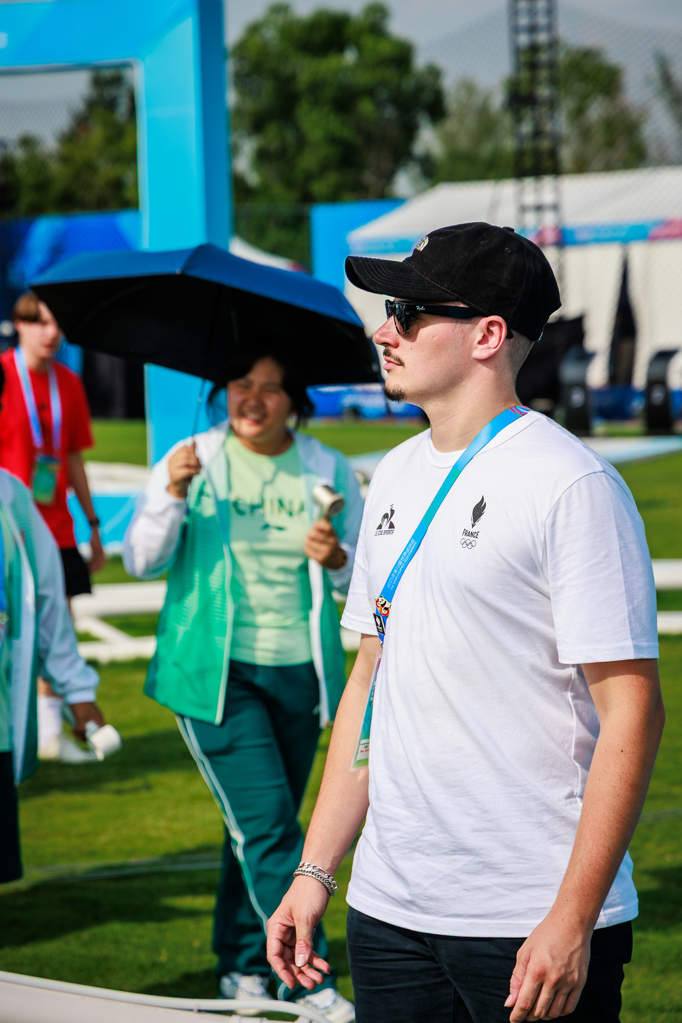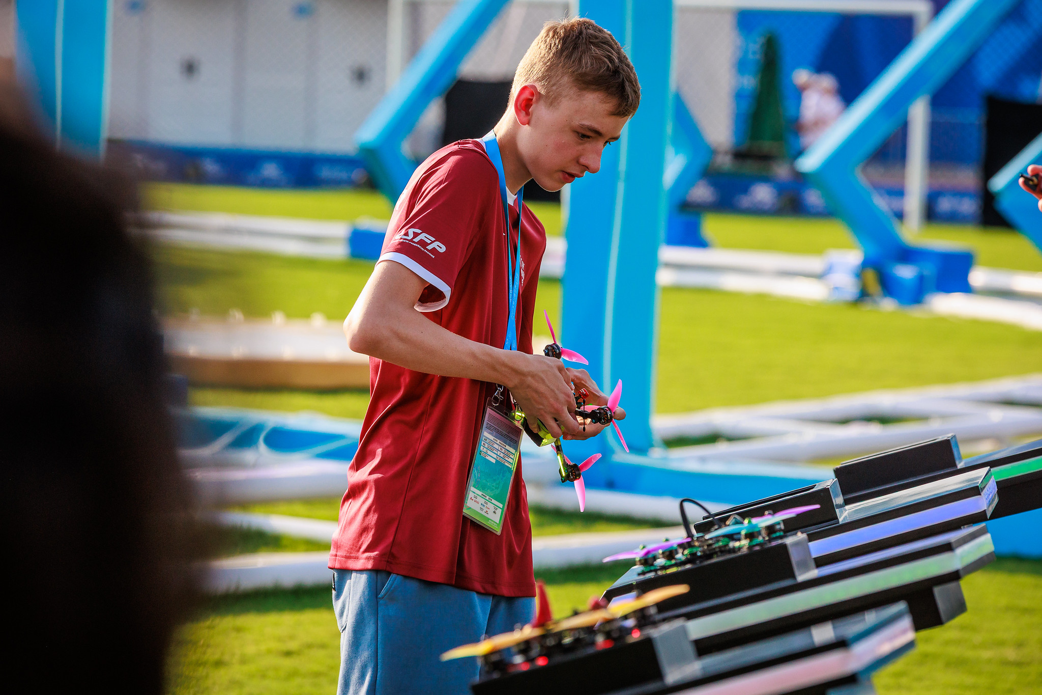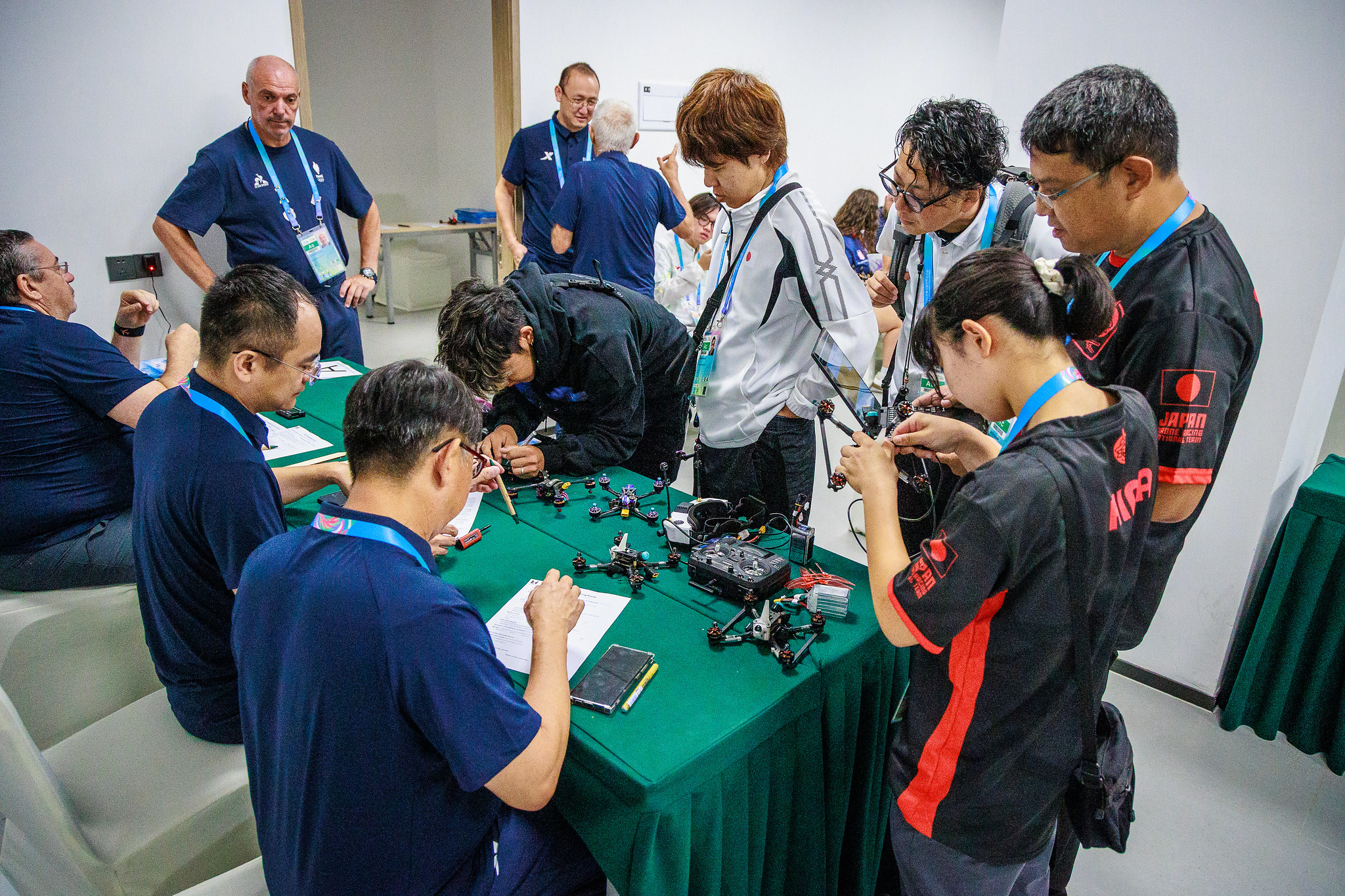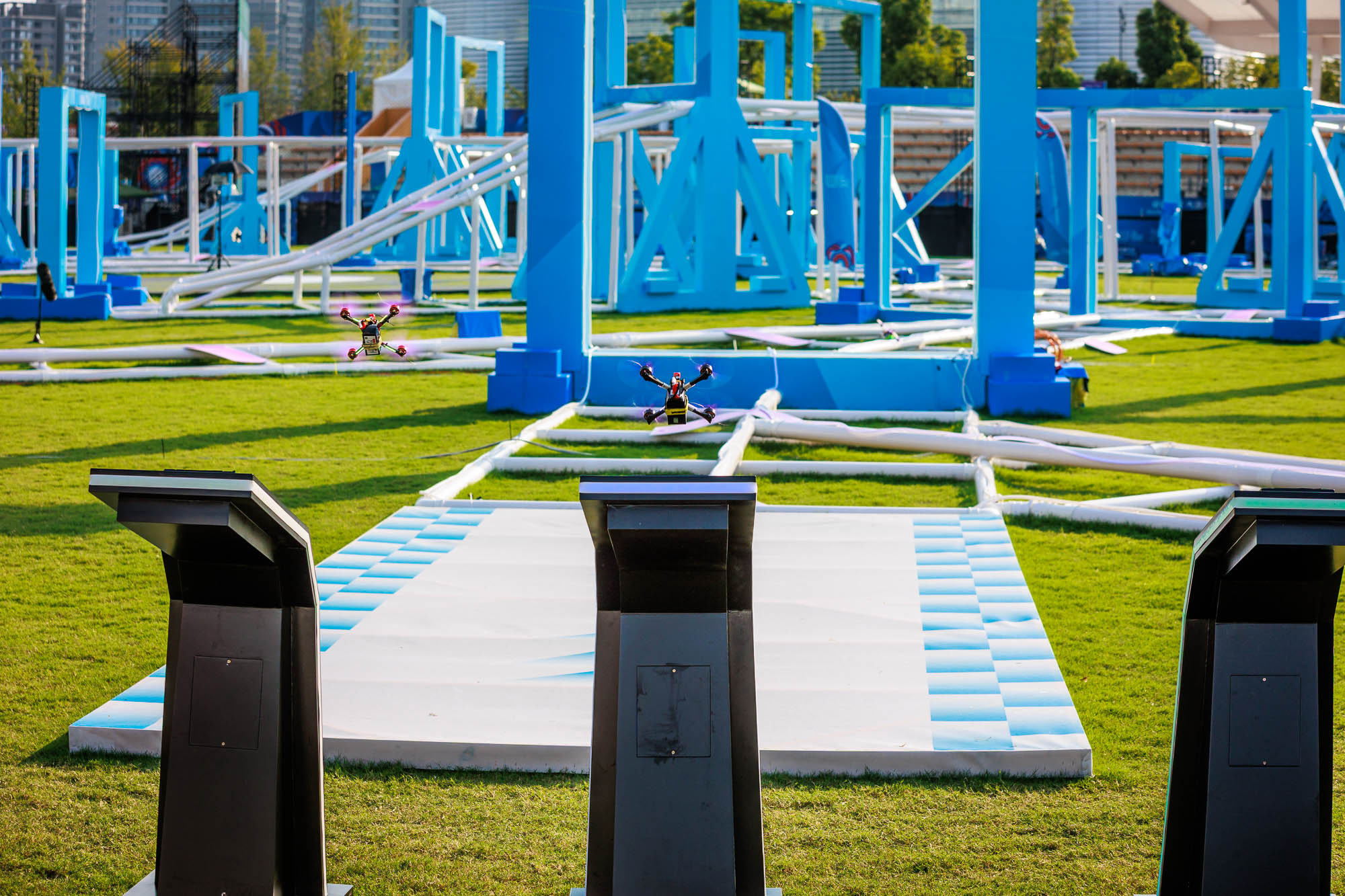 After a morning's work of drone preparation and model processing, the 31 drone pilots were bussed from the athletes' village to the drone racing venue, at the Dong'an Lake Sports Park Athletics Field.