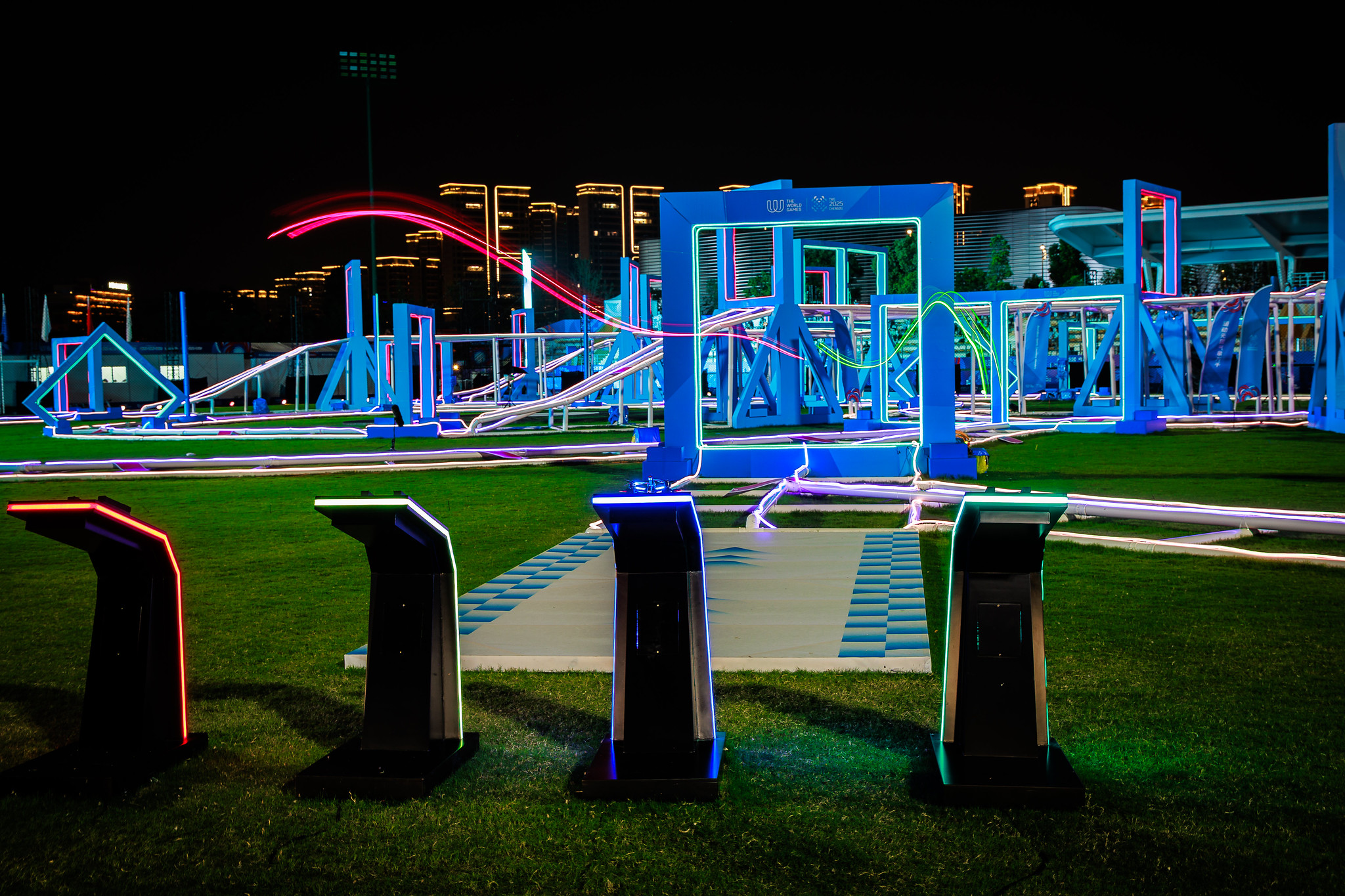 The track truly came alive at night when it was lit by thousands of LED lights. With spectators watching live in the stadium and each pilot's point of view being shown on the large screens, the competition atmosphere was charged and exciting.