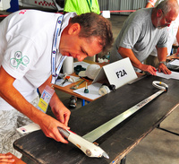 F2D is the combat category where again there are multiple pilots in the circle simultaneously. This time it is two, each with two mechanics on the ground. The aircraft are light in weight and very short from nose to tail so as to maneuver quickly in the air. Each has a 2,5 meter crepe paper streamer attached to the rear of the aircraft by a 3 meter string. Each pilot may attack the other’s aircraft at the streamer only in an attempt to cut the streamer with his or her model’s propeller or wing leading edge. Each cut scores 100 points. Each second the model is in the air scores a point and the match runs for 4 minutes from the starter’s signal to launch the aircraft. At the almost 200 kph speeds of the aircraft, mistakes of the pilots often lead to crash damage so two aircraft are allowed for each match. The mechanics (2 per pilot-contestant) are on the lookout for the crash and will quickly start the second aircraft, retrieve the streamer from the first and attach it to the reserve model before launching. The action is so fast that the new observer frequently cannot see the actual cuts of the streamers as they happen so quickly. Each competitor is allowed two losses before they are eliminated from the contest. The last survivor wins.