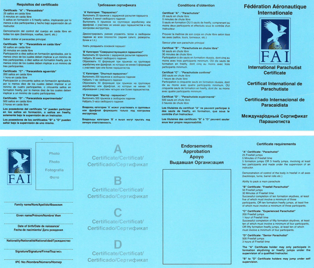 FAI Skydiving Commission (ISC) Open menu Close menu HomeNews NewsNews OrganisationOverview Bureau Members Presidents of Honour CommitteesCommittee and Working Group Members Technical & Safety Committee Delegates ISC Jurors Judges Interim Bureau Decisions Meetings ISC Public Mailing List Our SportOverview Accuracy Landing & Freefall Style Artistic Events Canopy Formation Canopy Piloting Dynamic Flying Formation Skydiving Indoor Skydiving Parachute-Ski Speed Skydiving Wingsuit Flying Hall of Fame Certificates of ProficiencyOverview Issuing Information and order Sample CompetitorsSporting Licence Competition Rules Competition Awards Antidoping Champions Ranking lists EventsISC Events Events Organisers ISC 1st & 2nd Category Results Portal ISC Youtube Channel RecordsRatified - current All Records Claims How to set a Record AwardsFAI Awards Competition Awards Documents Contact us Sample Certificate Cover: "A" certificate sticker: "Parachutist" "B" certificate sticker: "Freefall Parachutist" "C" certificate sticker: "Experienced Parachutist" "D" certificate sticker: "Senior Parachutist"