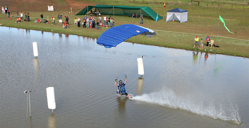 Canopy Piloting involves a series of tasks designed to test a parachutist’s ability to control the canopy and fly accurately. Each task starts with the parachutist navigating through a number of gates, which are situated on water. The parachutist has one of four goals, depending on the task; complete the course in the shortest time, therefore having the highest speed; complete the water section and then land on a target as accurately as possible; achieve the longest distance from the entry gate before touching down or perform freestyle manoeuvres while navigating the course in the most aesthetically appealing and precise manner.