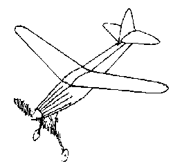 ROUND 1: Now Albert concentrated upon packing 1200 turns onto his rubber motor. Done. Albert placed his Wakefield in the proper ROG position on the take-off board, and let go! It was away! Climbing steeply, but straight under torque, then right, holding steady to the side thrust. Power off, the propeller free wheeled into the glide pattern, circling left in 200 yard circles. Flying OOS in 497 seconds, but with the Air Cadets in pursuit in their "Jeep". The Air Cadet Chase Team, was efficient because they stayed with Albert's Wakefield until it landed, and returned to the flying field with his plane undamaged. The defending Wakefield Champion Gordon S Light had a flight of 283.5 seconds, he was second. Denis Fairlie with 276.3 was third. Bob Copland was fourth, with 275.2 seconds, and the 1934 Wakefield Champion J B AIlman with 270.8 was fifth. Dick Everett with 270.0 was sixth, and John Ginnetti with 246.2 was seventh. Bill Atwood was eighth with 105.0 seconds, Andre Vincre was ninth, with 92.5 seconds, Roy Wriston was tenth with 100.0 seconds, and G. Dubois (p. Brown) was eleventh with 80.0 seconds. The ambient temperature was now over 90 degrees Fahrenheit.