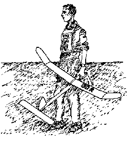 ROUND 8: Time: 7:45pm, the light to see a Wakefield for four and a half minutes was poor, at best. The officials did not want to postpone the fly-off, so now Joachim Loffler and Anders Hakansson were ordered to prepare to fly. After the horn sounded to begin this round they would have only three minutes to prepare. New Pirelli motors were stuffed into fuselages, each now stood hooked up, and ready to begin to wind at the starting horn. OOORRRNNN! Anders hands flew to the winder. Joachim was not far behind, both cranked on the turns, both plugged in their nose blocks, both prepared to launch, both launched! The winner must climb higher, and glide longer. Anders propeller was folding! Joachim's Wakefield was still on the prop, and it was still climbing! Anders Hakansson's Wakefield was down in 186 seconds. Joachim Loffler's Wakefield landed 55 seconds later. Truly a great victory for the Eastern Block political establishment! It was official! Joachim Loffler was the 1963 Wakefield Cup World Champion!