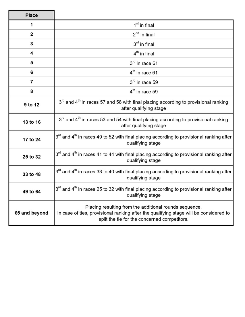 The individual overall classification concerns all competitors (including Juniors and Women) and will be established according to the table below.