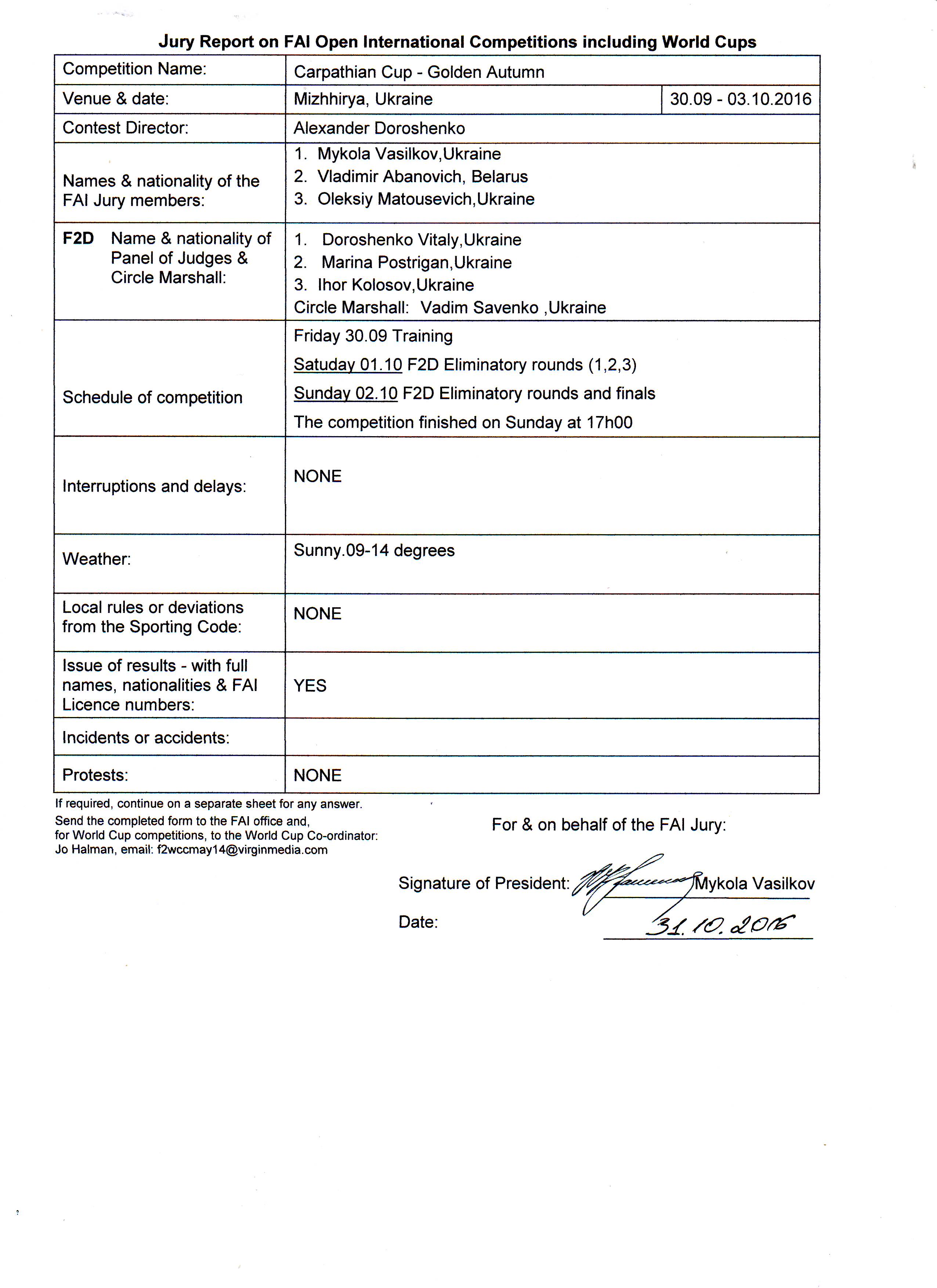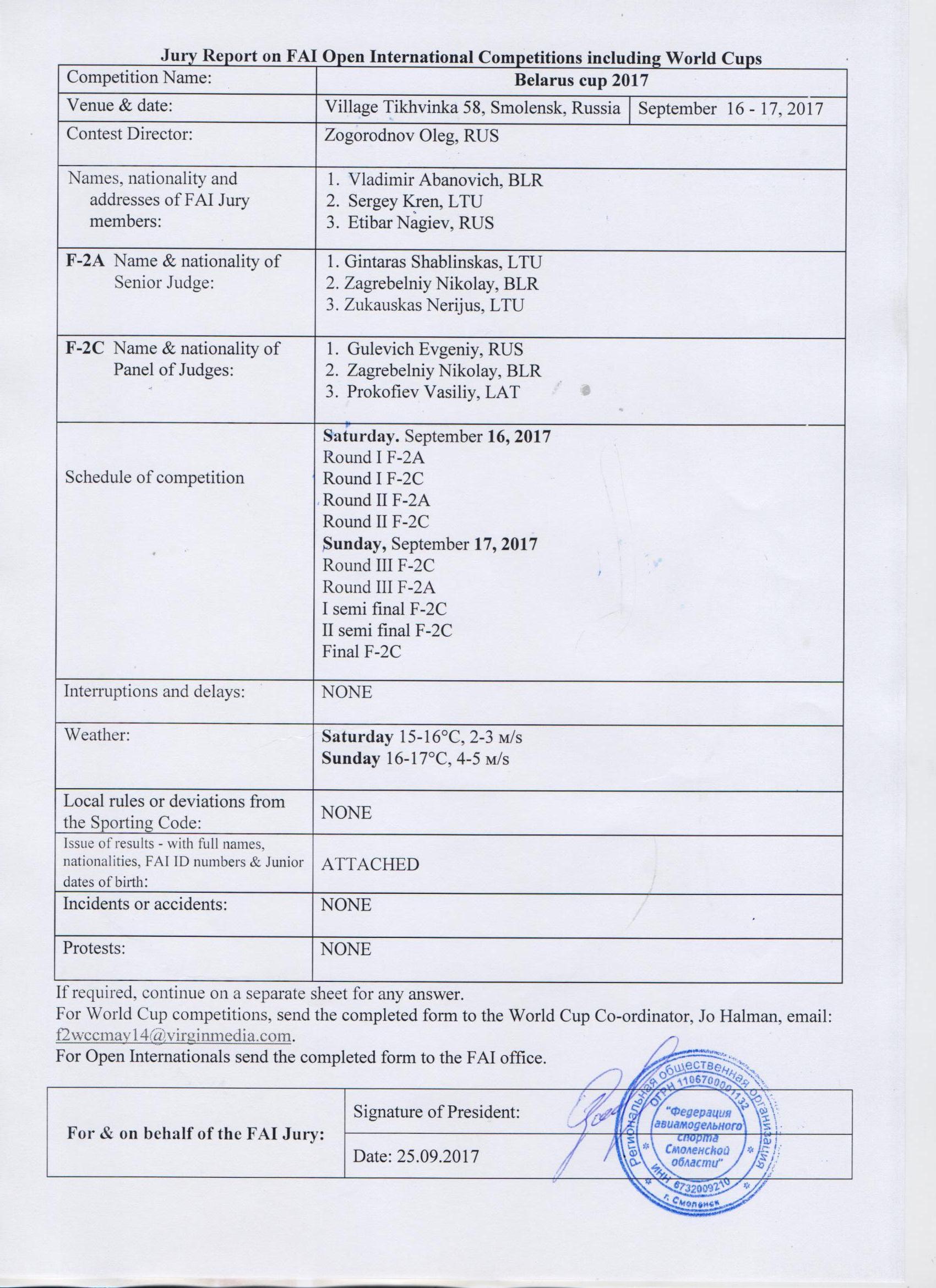 Supporting documents - templates of the F2 World Cup FAI Jury report and results were slightly modified. The columns named "FAI License" has been removed as these are not really needed due to use of the FAI ID only. All files are available to dowlnoad under the links bellow, and there is the option to download whole package containing or sigle templates: