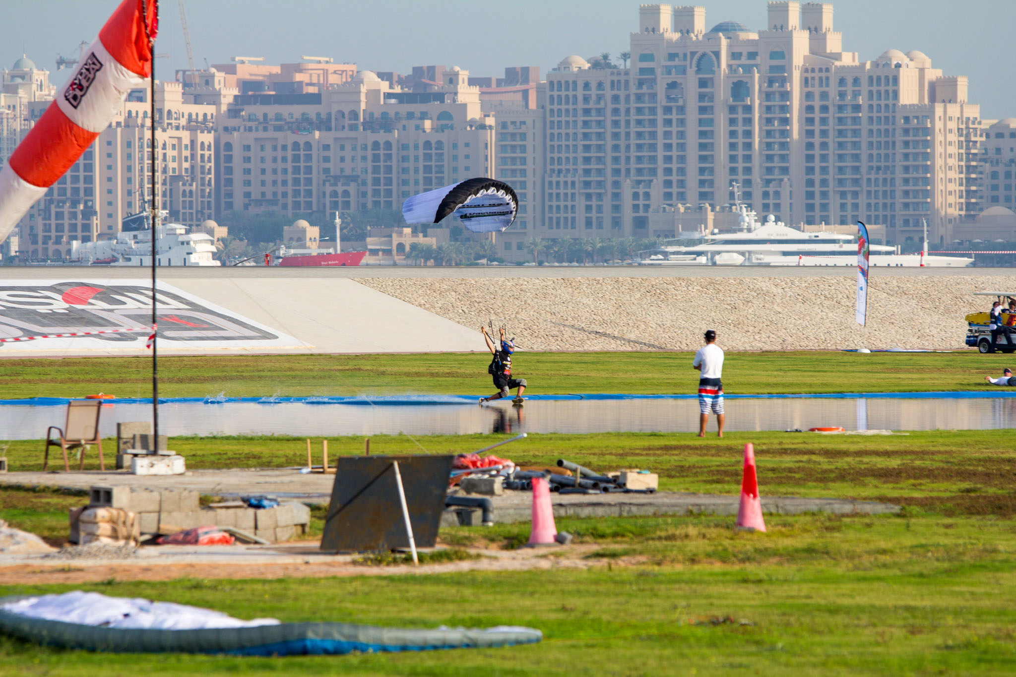 To maximise the accuracy, the competitor must successfully navigate the water section before landing as close to the centre of the target as possible. The maximum score for speed goes to the parachutist flying the course in the shortest time and the best score for distance will go to the parachutist controlling the canopy to fly the maximum distance.